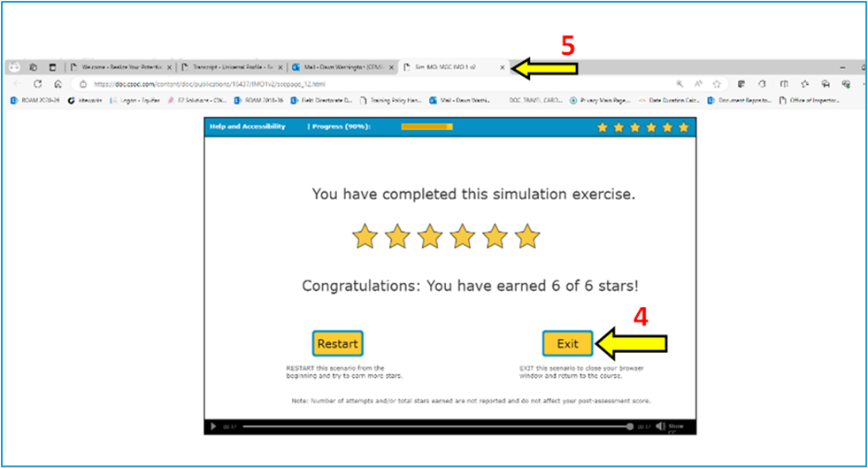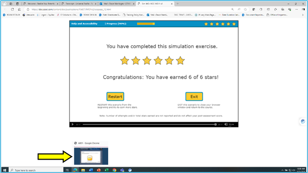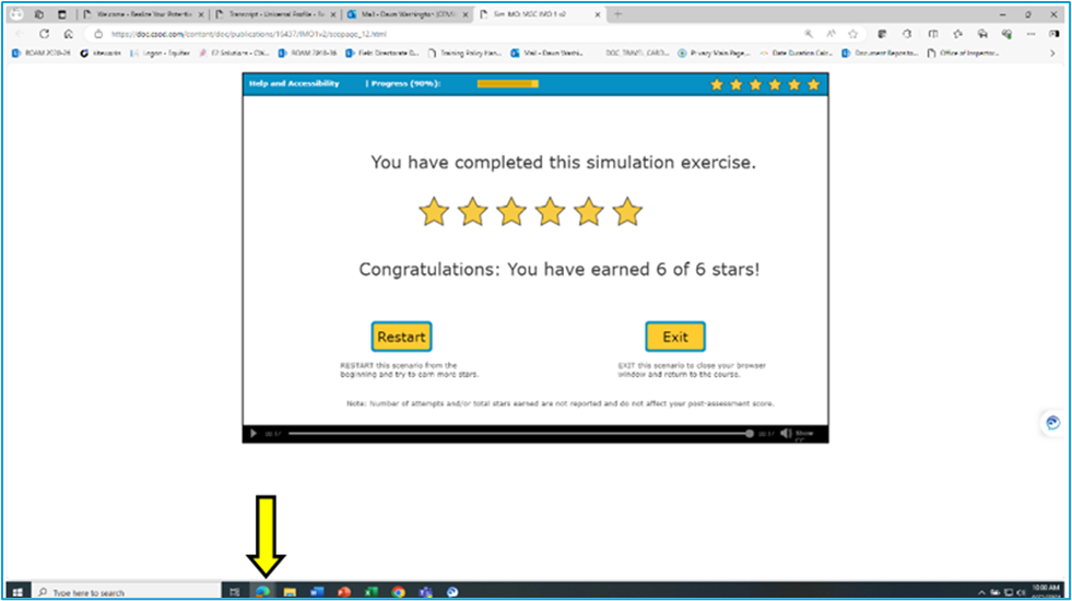 1. Please relaunch and complete 'Scenario 1'. Once you have arrived at the completion screen hover your mouse over the [INSERT BROWSER THE USER IS USING] icon at the very bottom of your screen. Please do not close the scenario window. [see image below]