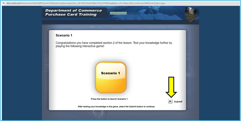 Should a user have issues getting the ‘DOC Customized Purchase Card Training Update FY2024’ course to move to completion-- whether they get stuck on a certain screen, the course itself stops, or after following the steps to exit the course they are redirected only to have to start over, please provide the instructions below.
